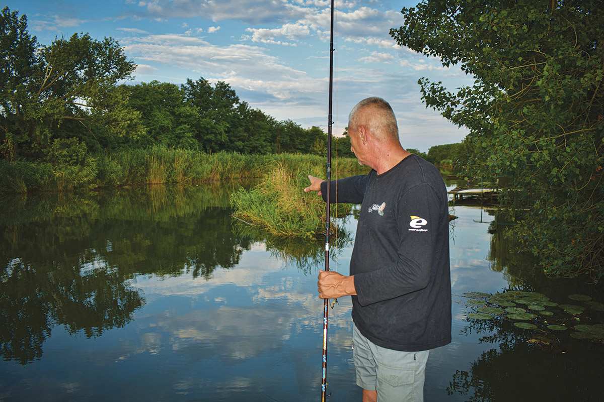 A helyszínen, ha nem túl nagy a vízfelület, és lehetséges, körbejárom a part mentén a tavat. Elsősorban partszéli táplálékhal-tartó növényzetet, bokrosokat, gyökeres partoldalakat, fűzféléket és terülő gyökérzettel rendelkező égerfákat keresek. Az időszakos befolyókat, lóbogártúrásos szakaszokat és a békás öblöket is megjegyzem, amik nagy zivatarok, esőzések után válhatnak lehetséges horgászhelyszínekké. A bejárást csónakból is megteszem, a szélekkel kezdem. Kiemelt figyelmet fordítok a befolyó árkokra, csatornákra és a zárt vízi növényzetben lévő tükrökre. Sok harcsa telepszik be hosszú távra ezekbe a horgászszempontból valószínűtlennek tűnő helyekre, köztük meglepően nagy példányok is.