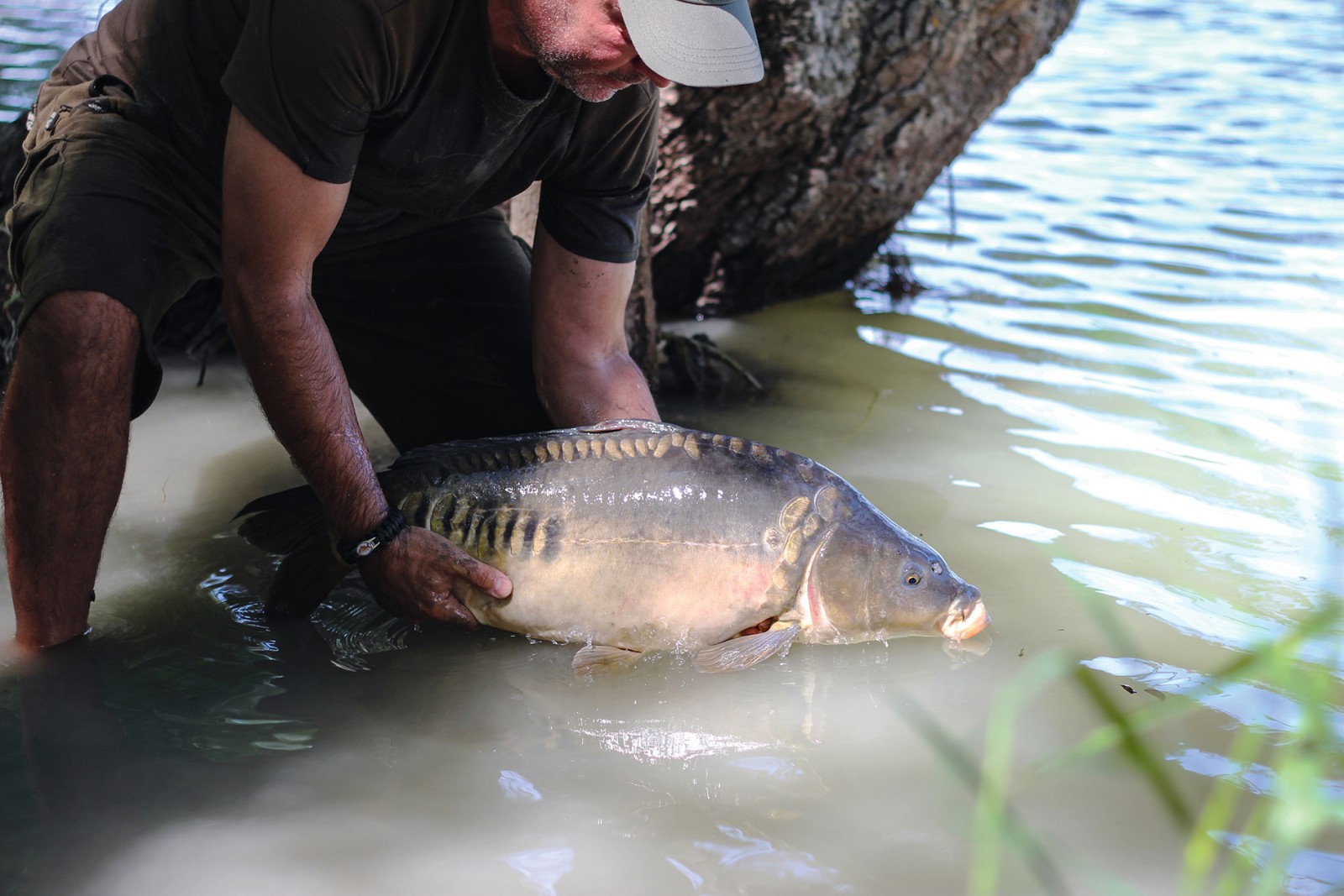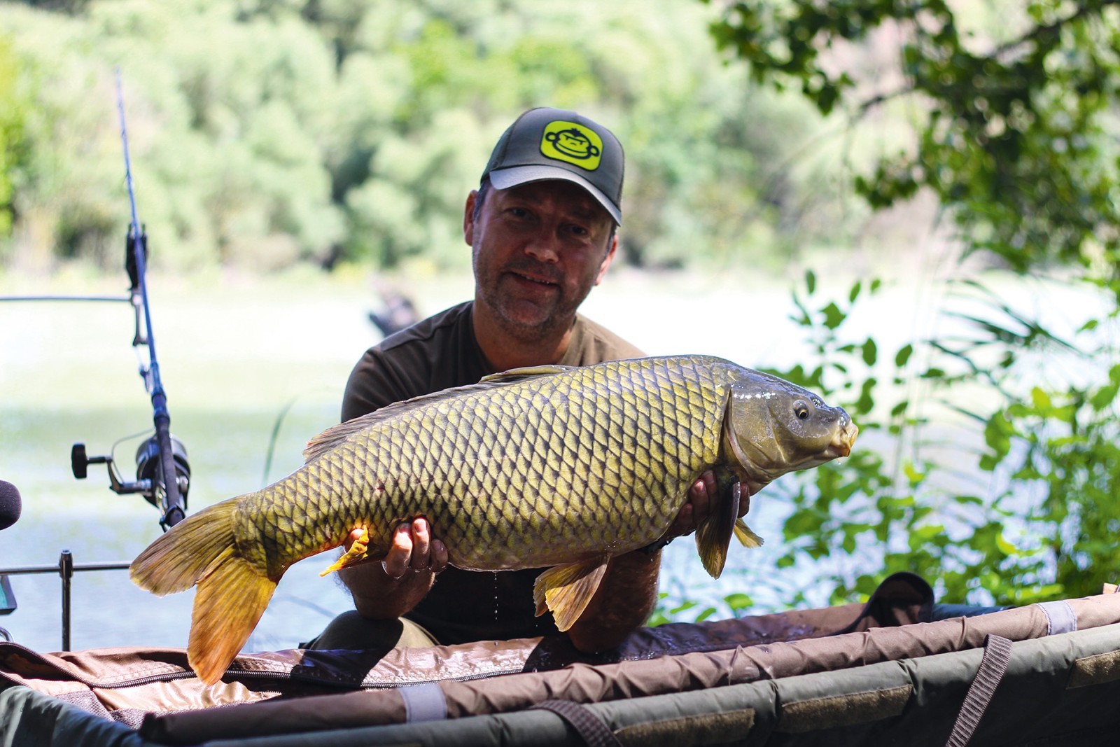 Nálam sem kellett sokat várni, hogy megszólaljon az egyik kapásjelzőm. A kapás nagyon erőteljes volt, felemeltem a botot, egyből éreztem, hogy valami jobb hal van a horgon. Gyorsan vízre mentem csónakkal, meg se próbáltam a partról kifárasztani ezt a halat. Feljött a víz tetejére, láttam, hogy egy nyurgaponty. Bevallom őszintén, egy kicsit nagyobb példányra számítottam, itt olyan erősek a halak, hogy hihetetlen. Megszákoltam a halat, gyorsan kisiettem vele a partra, és nagyon boldog voltam.