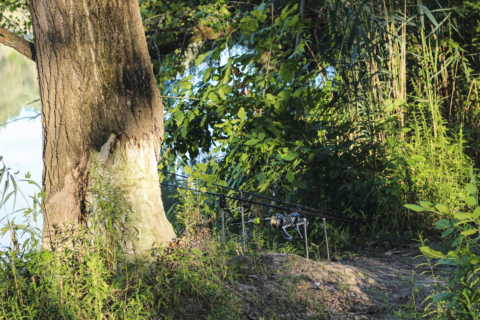 A helyválasztásban egyszerű dolgunk volt: Danyi Péter, egy régi barátunk segített, ki is választottuk a legmegfelelőbb helyet. Már amikor megérkeztünk, láttuk, hogy gyönyörű a hely, pezsgett a víz, madarakat láttunk, köztük egy ritkán megközelíthető vörös gémet. Célhalunk itt, ezen a területen a ponty volt, és az amur, ezekből is a nagyobbakat szerettük volna megfogni. De itt örülni kell bármekkora halnak. Két horgászhelyet tűztem ki célul. Az egyik távolabb volt, olyan 110-120 méterre, ide bojlival horgásztam. És volt egy közelebbi rész is, bokrokkal, amelyek kilátszottak a víz felszíne felett – ez olyan 70-80 méterre volt. Ide pedig maggal csaliztam. Mind a két helyre maggal etettem, tigrismogyoróval és kukoricával. Norbi a jobb oldalamon vetette be a pontyozó botokat, és ő is a túloldali bokorsor szélére rakta le a végszerelékeit.