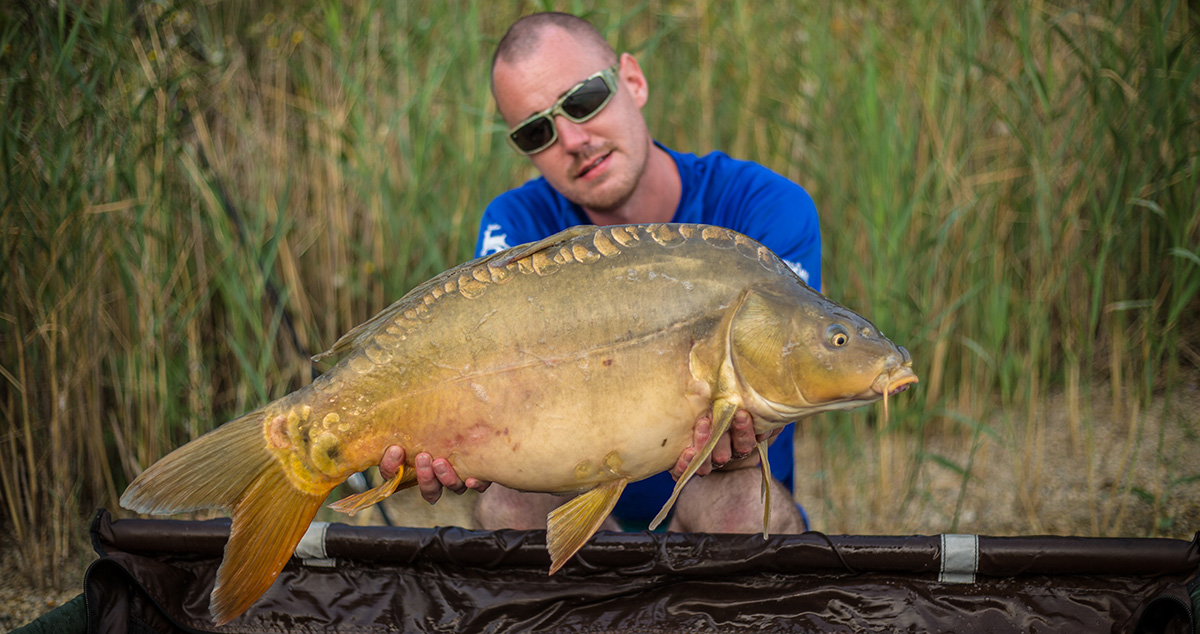 Óriási hőség fogadott bennünket, ami egészen a túra végéig kitartott. Nem időztünk, még a kora délelőtti órákban gyorsan összeállítottuk a tábort és a felszereléseket. A tavon természetesen engedélyezett a csónak használata, ezért a behordós módszer mellett döntöttünk, mivel az idős kavicsbánya aljzata sok helyen törésekkel és púpokkal tagolt. Halradar segítségével viszonylag hamar sikerült igazán jó helyeket találni, amit H bójával jelöltünk. Több púpon is találkoztunk vándorkagylóval, ami kiváló természetes táplálékforrás a halak számára, viszont a horgászok dolgát megnehezítheti a fárasztás során, ezért úgy döntöttünk, hogy minden halat csónakból szákolunk annak érdekében, hogy a kagylópad ne vágja el a zsinórt. Információink szerink a bőséges pontyállomány mellett az amurok is szép számmal megtalálhatók a vízben, ezért az etetésemet próbáltam olyan alapanyagokból összeállítani, aminek mindkét halfaj nehezen tud ellenállni. Nem kellett sokat gondolkodnom, hiszen az egyik legjobb termékcsalád erre a Gold széria. Gold magmixet és főtt bojlit kevertem be, amit Gold Groundbait mixerrel locsoltam le. A hajszálelőkéimre is Gold csalik kerültek, méghozzá 24 milliméteres főtt bojli az egyik etetésre, a másikra pedig 12 milliméteres pop-up.
