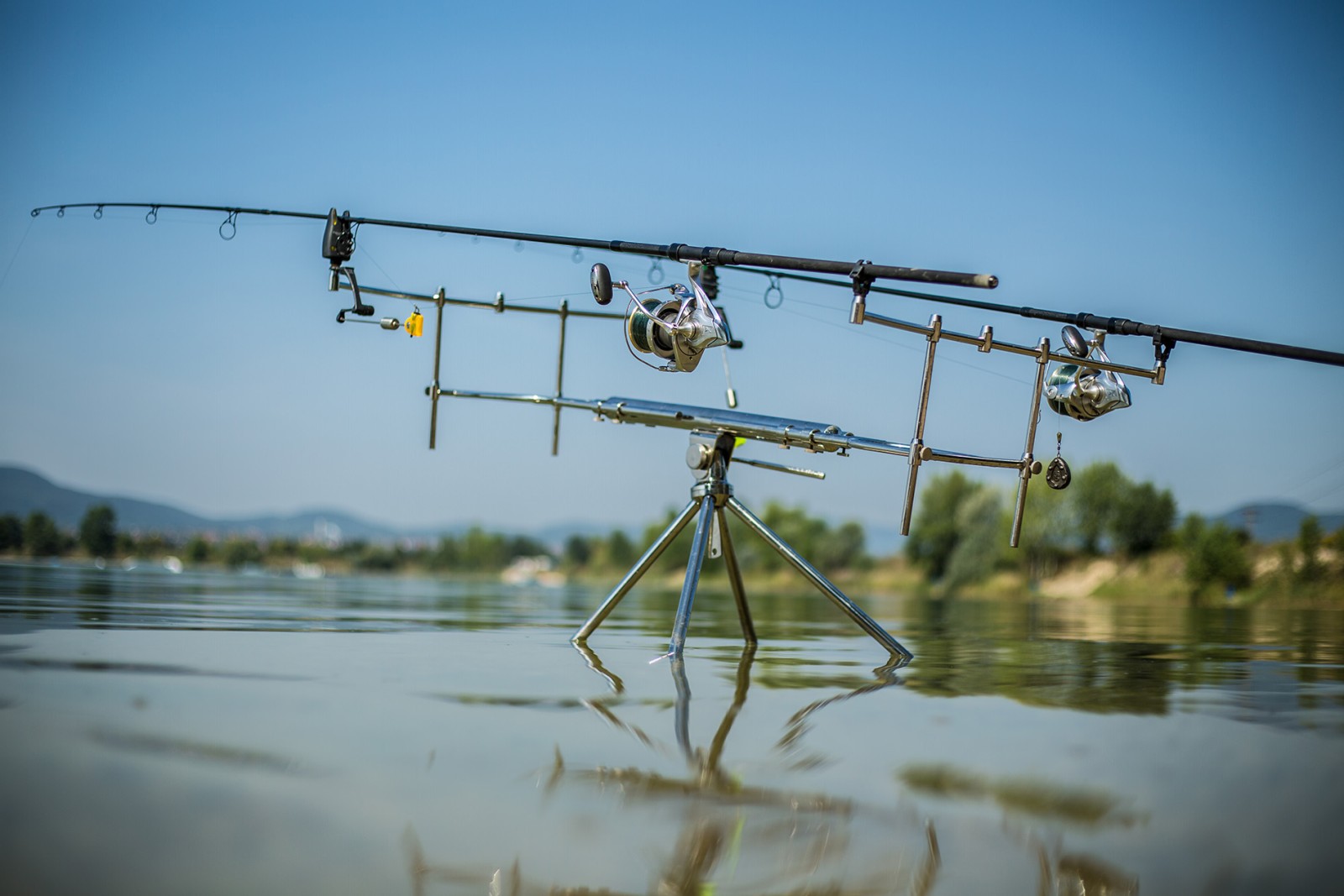 A tavon nem csak a horgászati lehetőség adott, a placcunkkal szembeni oldalon egy igényesen kialakított, színvonalas strandrész található, ahol fontos szerepet fordítanak a vízi sportokra is. A távolabbi bójámat a velünk szemben elhelyezkedő wakeboard-pálya egyik oszlopa közelébe helyeztem, ahol körülbelül öt méter volt a vízmélység. Józsival azon tűnődtünk, hogy a hőségre való tekintettel inkább az esti, hűvösebb órákban számíthatunk kapásokra, de ezt viszonylag rövid időn belül megcáfolták a halak. A nagyobb távolság ellenére igazi erős, húzós kapásra emelhettem rá, majd egy izgalmas fárasztás után szákolhattam meg első Lupa-tavi pontyomat.