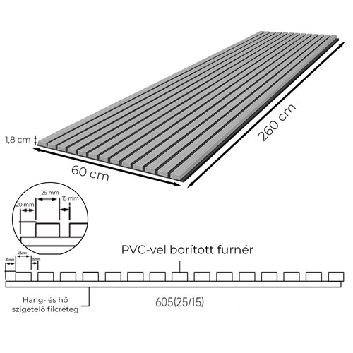 Akusztikus falpanel – Bambusz hatású, 260×60×1,8 cmMéret: 260 × 60 × 1,8 cmSzín: Bambusz hatású, természetes faerezet mintázattalFelület: PVC borítás három oldalonAlapréteg: Nagy sűrűségű, formatartó farostlemez (MDF)Hátlap: Akusztikai szigetelőréteg – zajcsökkentő, hőszigetelő filcHordozó: Strapabíró, környezetbarát műanyag alap (PET)Lécszélesség + hézag: 25 mm + 15 mmKörnyezetvédelmi besorolás: P2 – fenntartható alapanyag-felhasználássalBambusz akusztikus falpanel – természetes stílus és hangzásjavításA leziter bambusz hatású akusztikus falpanel egyszerre ad modern, letisztult megjelenést és javítja a helyiség hangzását. A faerezet élethű mintázata és a meleg árnyalat természetes harmóniát teremt, miközben a minőségi háromoldali PVC borítás védi a felületet a mindennapi igénybevételtől és könnyen tisztítható.Minőségi anyaghasználat a bambusz hatású akusztikus falpanelbenA panel formatartó faalapú lécekkel (MDF – közepes sűrűségű farostlemez) készül, amelyek stabil szerkezetet biztosítanak és ellenállnak a deformációnak. A hátoldalon található akusztikai filc szigetelőréteg hatékonyan csökkenti a zajt, mely nyugodtabb, kiegyensúlyozottabb hangzást teremt. Az egész szerkezetet egy erős, környezetbarát műanyag alapréteg (PET – újrahasznosított műanyag) tartja össze, amely gondoskodik a panel formastabilitásáról és tartósságáról.Akusztikus falpanel modern lécezéssel és sokoldalú felhasználássalA 25 mm széles lécek 15 mm-es hézagokkal modern, ritmusos mintát alkotnak, amely javítja a hanghullámok elnyelését és szóródását. A sötét akusztikai háttér kiemeli a bambusz árnyalat eleganciáját, míg az egyszerű rögzíthetőség lehetővé teszi falra vagy mennyezetre való telepítését otthonokban, irodákban és vendéglátóhelyeken egyaránt.Kinek ajánljuk a bambusz hatású akusztikus falpanelt?Otthonteremtőknek, akik természetes, meleg hangulatot szeretnének a belső térben.Belsőépítészeknek és lakberendezőknek, akik akusztikai és esztétikai szempontból is megbízható megoldást keresnek.Kávézók, éttermek, irodák tulajdonosainak, ahol fontos a kellemes hangzás és a modern dizájn.A Leziter bambusz hatású akusztikus falpanel háromféle stílusos árnyalatban érhető el: bambusz, olajos tölgy és dió. A tökéletes összhatás érdekében ajánljuk hozzá az azonos színű végzáró léceket, amelyek esztétikusan zárják le a burkolatot. A termékből a minimum rendelhető mennyiség két csomag.Szerelési útmutató – akusztikus falpanelek és végzárólécek egyszerű telepítéseMérjük ki a felszerelés pontos helyét a falon.Mérjük le a bambusz hatású akusztikus falpanelt.Vágjuk méretre, hogy pontosan illeszkedjen a kívánt felületre.Vigyünk fel ragasztót a panel hátoldalára.Rögzítsük a panelt a fal felső részén szegezéssel a biztos tartás érdekében.Ismételjük a folyamatot a teljes felület burkolásáig, majd élvezze az elkészült, esztétikus és hangzásjavító falburkolatot.