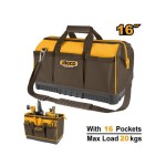 INGCO Szerszámtáska 16 zsebes Eszköztárolás napi használatra1. A termék 1680D anyagból készült, amely kopásálló, szakadásálló és tartós.2. A táska alja kopásálló, vízálló és szúrásálló.3. A nyitott kialakítás nagy tárgyak tárolását teszi kényelmessé.4. A partícionált zsebek növelik a tárolóhelyet és ésszerűen tárolhatók.5. Állítható vállpánttal rendelkezik a könnyű szállítás érdekében.Anyaga: 1680D poliészterMaximális terhelhetőség: 20 kgMéret: 410 x 250 x 260 mmTartós váz a könnyű hozzáférhetőség érdekébenErősített műanyag aljzatBelső zsebek a további tárolás érdekébenÁllítható vállpánt Szállítási terjedelem: 1 db szerszámtáska, Papírkártya csomagolás