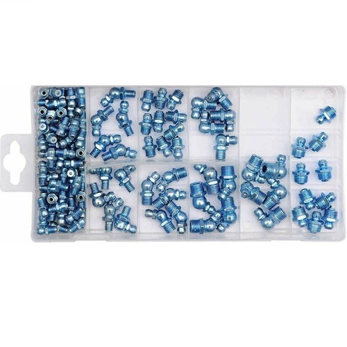 Különbözõ méretû egyenes és szögletes zsírzógömbök. Metrikusan vágott menetek. Rendszerezõ dobozban, rekeszekkel. A fedél belsejében látható mérettáblázat a gyors azonosítás érdekében. Tökéletes otthoni, mûhelyi és szervizekben történõ használatra.