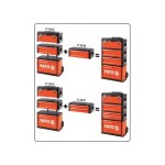 YATO Moduláris szerszámkocsi Moduláris 3-részes szerszámos szekrény. A készlet tartalmaz egy alsó dobozt beépített kerekekkel, kihúzható alumínium fogantyúval és egy nagy, kihúzható fiókkal. Az alsó modul teherbírása 15 kg, méretei 410x210x280 mm. A középső modulban található 1 fémből készült fiók, amelynek teherbírása 10 kg, méretei pedig 390x215x130 mm. A fiók golyóscsapágyas fém sínre van szerelve. A felső modul egy klasszikus szerszámosláda, méretei 420x220x150 mm, teherbírása 20 kg. Beépített 2 kihúzható szervezővel és szerszámtálcával rendelkezik. A modulok teteje lapos, amelyet munkafelületként is lehet használni. Ezen kívül rendelkeznek egy nagyon hasznos horonnyal fúrás vagy csavarozás céljából. Emellett a moduloknak kényelmes csúszásgátló fogantyújuk, oldalsó fogantyújuk a könnyű emeléshez és csúszásgátló alsó sarkuk van.Lehetőség van a 3-modulos készlet 4 modulossá bővítésére a YT-09107 vagy YT-09108 középső modul hozzáadásával. A fő és középső modulokon fémszerelvények vannak a készletek összekapcsolásához, az alumínium fogantyú pedig további zárral rendelkezik a modulok rögzítéséhez. A YATO szerszámtálcákba előre elkészített szerszámkészleteket lehet betenni.
