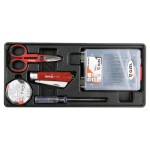 YATO Szerszámkészlet 23 részes (fiókbetét) Fiókba illeszthető tartó, amely fémfúrókat, szigetelőszalagot, ollót és elektromos mintavevőt tartalmaz. – patron – YT -1974 olló 140 mm – műhelykés YT -7600 – ELTHORTIC STATER YT -2830 – YT -8165 szigetelőszalag – fémfúrók 1,0 mm-től 10 mm-ig Használati figyelmeztetések: A kéziszerszámok használata veszélyes lehet! Mindig használjon személyes védőfelszerelést munka közben. Csak megfelelő és sérülésmentes szerszámokat használjon. Válassza ki a szerszám típusát és méretét a tervezett alkalmazásnak megfelelően. Ne terhelje túl a szerszámokat. Tartsa a szerszámokat távol a gyermekektől. Gondosan használja a szerszámokat.