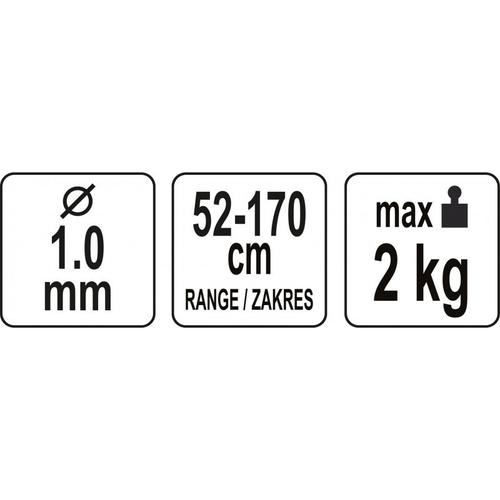 YATO Szerszámtartó kötél 2 kg-ig Rugós kötél kialakítása hatékonyan védi az eszközöket a véletlen leesés és károsodás ellen. Különösen hasznos magassági munkáknál, mint például állványok, acélszerkezetek, stb.Rozsdamentes acél kötél PVC hüvelybenmindkét végén karabinerrel rögzített végnyújtási tartomány: 52 – 170 cmátmérő: 1 mmmaximális terhelés: 2 kg Hatékonyan védi az eszközöket a véletlen leesésektől. Különösen fontos magassági munkáknál / állványoknál, létráknál, épületszerkezeteknél, stb.