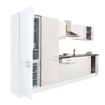 Yorki 330 konyhabútor fehér korpusz,selyemfényű fehér fronttal polcos szekrénnyel és alulfagyasztós hűtős szekrénnyel