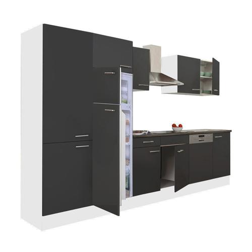 Yorki 340 konyhabútor fehér korpusz,selyemfényű antracit fronttal polcos szekrénnyel és felülfagyasztós hűtős szekrénnyel