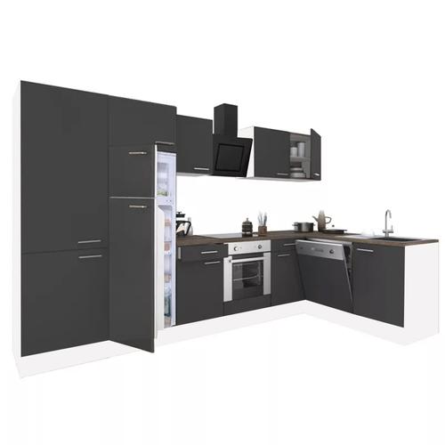 Yorki 340 sarok konyhabútor fehér korpusz,selyemfényű antracit front alsó sütős elemmel polcos szekrénnyel, felülfagyasztós hűtős szekrénnyel