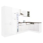 Yorki 340 sarok konyhabútor fehér korpusz,selyemfényű fehér fronttal polcos szekrénnyel és felülfagyasztós hűtős szekrénnyel