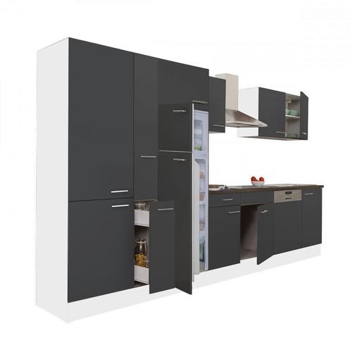 Yorki 370 konyhabútor fehér korpusz,selyemfényű antracit fronttal polcos szekrénnyel és felülfagyasztós hűtős szekrénnyel