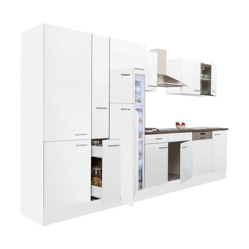 Yorki 370 konyhabútor fehér korpusz,selyemfényű fehér fronttal polcos szekrénnyel és felülfagyasztós hűtős szekrénnyel