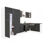 Yorki 370 sarok konyhabútor fehér korpusz,selyemfényű antracit fronttal polcos szekrénnyel és felülfagyasztós hűtős szekrénnyel