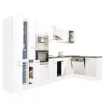 Yorki 370 sarok konyhabútor fehér korpusz,selyemfényű fehér fronttal alulagyasztós hűtős szekrénnyel