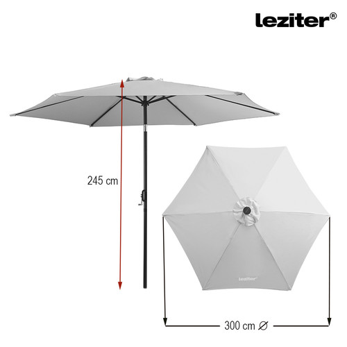 Solari kerti napernyő led lámpával szürke 300 cmForma: kör alakúÁtmérő: 300 cmTeljes magasság: kb. 245 cmSzín: szürkePonyva anyaga: 160 g/m² poliészter PA bevonattalPonyva jellemzői: vízlepergető felület, szegélyezett kialakításVáz anyaga: acélKözéposzlop: 38 × 0,7 mm acélBordák: 6 db acél borda (12 × 18 × 0,45 mm)Ponyvarögzítés: bordavégekre illesztett, feszes kifeszítésMűködtetés: kézi tekerőkaros nyitás és zárás (UP / DOWN irányjelöléssel)Dönthetőség: gombbal működtethető dönthető funkcióVilágítás: beépített LED világítás a bordák menténVilágítás működése: napelemes egységgel, 3 db AAA 800 mAh akkumulátorralKialakítás: középoszlopos napernyőTalp: nem tartozékFelhasználás: kültéri, kerti és teraszos használatraKör alakú kerti napernyő árnyékolás kialakításáhozA Leziter Solari kerti napernyő 300 cm átmérőjű kialakítással rendelkezik, amely egyenletes lefedést biztosít a középoszlop körül. A kör alakú forma jól használható kertekben, teraszokon vagy kerti bútorok fölött. A ponyva kialakítása a mindennapi kültéri használathoz igazodik, felülete vízlepergető, így a nedvesség nem szívódik fel azonnal. A szürke szín világos, visszafogott megjelenést ad, amely könnyen illeszkedik különböző kültéri környezetekhez.Acél vázas, tekerőkaros és dönthető kerti napernyő LED világítássalA Solari napernyő acél középoszloppal és hat darab acél bordával rendelkezik, amelyek a ponyva megtartását és kifeszítését szolgálják. A ponyva szegélyezett kialakítású, a bordavégeknél feszesen illeszkedik a szerkezethez.A kézi tekerőkaros mechanika fel- és leengedést tesz lehetővé, a forgatókar egyértelmű irányjelöléssel ellátott. A dönthető funkció nyomógombbal működtethető, amely lehetővé teszi a ponyva dőlésszögének módosítását a kívánt beállítás szerint. A bordák mentén elhelyezett beépített LED világítás esti és alkonyati használat során kiegészítő fényt biztosít.Kinek ajánlott a Solari kerti napernyő led lámpával?A Leziter Solari kerti napernyő azok számára lehet megfelelő választás, akik kör alakú, középoszlopos napernyőt keresnek kertbe vagy teraszra, és a nappali árnyékolás mellett az esti használat lehetősége is fontos számukra. Ajánlott kerti asztalok, pihenőbútorok fölé, ahol előnyt jelent a kézi kezelhetőség, a dönthető kialakítás és az integrált LED világítás. A napernyő különálló talppal használható, a talp nem része a csomagnak.