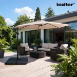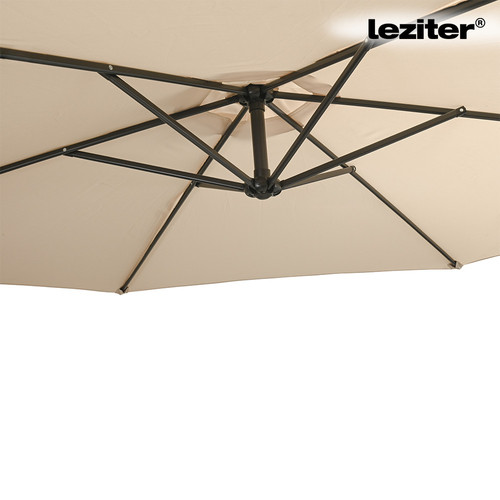 Sunny kerti napernyő bézs 300 cmForma: kör alakúÁtmérő: 300 cmTeljes magasság: kb. 245 cmSzín: bézsPonyva anyaga: 160 g/m² poliészter PA bevonattalPonyva jellemzői: vízlepergető felület, szegélyezett kialakításVáz anyaga: acélTartóoszlop: 48 × 1,0 mm acélBordák: 6 db acél borda (12 × 18 × 0,45 mm)Ponyvarögzítés: bordavégekre illesztett, feszes kifeszítésMűködtetés: kézi tekerőkaros nyitás és zárásDönthetőség: kézzel állítható, dönthető kialakításKialakítás: oldalkaros (banana) napernyőTalp: kereszt alakú vázszerkezet4 külön elemből álló napernyősúly: NEM TARTOZÉKFelhasználás: kültéri, kerti és teraszos használatraKör alakú kerti napernyő árnyékolás kialakításáhozA Leziter Sunny kerti napernyő 300 cm átmérőjű kialakítással rendelkezik, amely egyenletes lefedést biztosít az árnyékolt területen. A kör alakú forma jól használható kertekben, teraszokon vagy kerti bútorok fölött. A ponyva kialakítása a mindennapi kültéri használathoz igazodik, felülete vízlepergető, így a nedvesség nem szívódik fel azonnal. A bézs szín világos, visszafogott megjelenést ad, amely könnyen illeszkedik különböző kültéri környezetekhez.Acél vázas, tekerőkaros és dönthető kerti napernyőA Sunny napernyő acél tartóoszloppal és hat darab acél bordával rendelkezik, amelyek a ponyva megtartását és kifeszítését szolgálják. A ponyva szegélyezett kialakítású, a bordavégeknél feszesen illeszkedik a szerkezethez.A kézi tekerőkaros mechanika fel- és leengedést tesz lehetővé. A dönthető kialakítás lehetővé teszi a ponyva dőlésszögének módosítását a kívánt beállítás szerint.Kinek ajánlott a Sunny kerti napernyő?A Leziter Sunny kerti napernyő azok számára lehet megfelelő választás, akik kör alakú, oldalkaros napernyőt keresnek kertbe vagy teraszra. Ajánlott kerti asztalok, pihenőbútorok fölé, ahol fontos a szabadon hagyott középtér, a kézi kezelhetőség és a dönthető kialakítás. A napernyő kereszt alakú talpszerkezettel használható, a talp nem része a csomagnak.