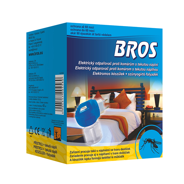 A készülék védelmet nyújt zárt helyiségekben szúnyogok, legyek, és más repülő rovarok ellen. Elektromos hálózatba helyezve, bekapcsolását követően párologtatja az aktív hatóanyagot tartalmazó folyadékot, 8 óra használat melett 60 napig. Használati utasítás: A folyadékot helyezze be alulról a készülékbe, majd dugja be a fali 220V-os hálózati csatlakozóba. A folyadék párolgása egész éjszaka védelmet biztosít a szúnyogok ellen. A készüléket használat után húzza ki a fali csatlakozóból. Figyelem: Gyermekek, betegek, vagy érzékeny személyek mellett, használja inkább a BROS SENSITIVE szúnyogirtó készüléket.