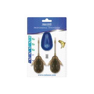 Cralusso Double CHANCE Method kosár szett Manapság rengeteg horogcsali közül választhatunk, ízben, színben, méretben, súlyban formában eltérőek. Mindannyiunk számára problémát jelent a legfogósabb csali megtalálása. Ezt a problémát felismerve fejlesztettük ki az egyedülálló megoldású hosszanti bordás, Dupla Sansz névre keresztelt method kosarat, mely erre a kérdésre nyújt segítséget. Ezzel a különleges szerkezettel, egy időben akár többféle csalit is kipróbálhatunk ugyanolyan körülmények között. Legyen az színben, méretben, ízben, fajsúlyban eltérő csali. Szerelhetjük 1 vagy 2 horoggal, de akár egy horgon és két csalitüskén elhelyezett csalival is használhatjuk. Tehát a Dupla Sansz kosárral, többféle csali egyidejű használatával, gyorsan egyértelművé válik, hogy az adott helyen és időben, mely csalit részesítik előnyben a halak.Töltéséhez a forradalmian új megoldású SHELL töltő szerszámot ajánljuk, mellyel a leggyorsabban és legegyszerűbben tölthetjük kosarunkat. A horgászok igényeinek megfelelően, a method kosarak a szerelék megbontása nélkül a zsinórról egy pillanat alatt levehetők, cserélhetők. Nagy szabadságot biztosítva, szállításhoz, vagy a különböző súlyú method kosarak variálásához. Tippek a Dupla Sansz kosár használatához Egyhorgos megoldásnál hagyományos módon alkalmazzuk, főleg az iszaposabb helyeken, ahol kevésbé süllyed el kosarunk, nagyobb felületének köszönhetően. Két horog használat esetén, eltérő csalikat alkalmazzunk, melyeket helyezzük el a szétnyitható univerzális Shell töltő szerszámban egymás mellé és töltsük meg kosarunkat. Kapásnál a hal felveszi a neki tetsző csalit és meghúzza azt, ilyenkor a másik horog, a szárny alá csúszik, megütközik és létrejön az akadás. A Dupla Sansz kosár úgy lett kialakítva, hogy fárasztás és szákolás közben, a másik horog, ne zavarjon, egy védett helyre csússzon. Az eredményes horgászat érdekében fontos, hogy jegyezzük meg, melyik horgon, mit használtunk. Javasoljuk, hogy töltés előtt jegyezzük meg, a hosszanti bordájú kosár jobb és baloldali horgára milyen csalit helyettünk. Ez a különleges method kosár abban is segíteni fog melyik csalinkra volt kapás. Ha elvétettük a kapást, vagy a halunkat, a hosszabb kihúzott előke mutatja, melyik csalira volt érdeklődés. Azokon a helyeken, ahol csak egy horog használata engedélyezett, működhet úgy is hogy a középső horog mellet, jobbra és balra egy-egy csalitüskén, más csalikat kínáljunk fel és a legfogósabbakat tegyük a horgunkra. Szerelése a következő képen történjen, fluoro karbon, vagy fonott damilra kössük fel horgunkat, majd egykb.35 cm-es részt fűzzük át a kialakított nyílásokon. A kívánt előkehosszt beállítva, kössük fel a zsinór másik végére, lehetőleg szakál nélküli horgunkat. Javaslom a Cralusso műanyag csalitüskéjének alkalmazását, melyet a csomagolásban mellékelt szilikonból vágott apró csővel rögzíthetünk egyszerűen a horgon. Figyelem a két horog használata esetén, fokozottan figyeljünk a horog szabadításnál a másik szabadon lévő horog beakadásának veszélyére, annak ellenére, hogy a másik horog védett helyre csúszott. Ajánlott a szakál nélküli, vagy lenyomott szakálú horgok használata. Sok sikert a használatához!
