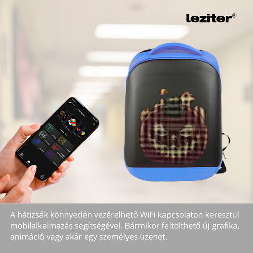 Pixa ledes okos hátizsák – kék szín Legyen a Tiéd a Leziter Pixa LED okos hátizsák, és mutasd meg a világnak a stílusod, a kreativitásod és az egyéniséged minden lépéseddel – mert mostantól te írod a saját fényüzeneteidet! A Leziter Pixa WiFi vezérelt LED-es okos hátizsák lehetővé teszi, hogy az aktuális hangulatodat, kedvenc mintáidat vagy akár személyes üzeneteidet is megjelenítsd a hátizsákodon. A 25 × 25 cm-es LED kijelző 64 × 64 pixeles felbontással és 3,9 mm-es ponttávolsággal biztosítja a tiszta, élénk megjelenítést. Power bankról működtethető (USB 5V), így akár útközben is használhatod. WiFi-kapcsolat és RHX Plus applikáció A kijelzőt WiFi kapcsolattal vezérelheted, az RHX Plus nevű applikáción keresztül, amely elérhető Androidra és iOS-re is. A csatlakozás egyszerű: a táska saját WiFi-hálózatához kell kapcsolódni, majd saját grafikát, szöveget, animációt vagy akár pixelartot is feltölthetsz a kijelzőre néhány kattintással. A QR-kód az útmutatóban található, amely megkönnyíti a letöltést. Power bankkal működik, így bárhol feltöltheted A hátizsák beépített USB töltőporttal rendelkezik, így könnyedén csatlakoztathatod hozzá a saját power bankodat (nem tartozék). Ezáltal a kijelző működéséhez szükséges tápellátást bárhol biztosítani tudod, miközben akár a telefonodat is töltheted menet közben. Tartós, praktikus, kényelmes – minden részletében átgondolt Strapabíró anyaghasználat – PC + ABS borítás, amely vízlepergető, ütésálló és könnyen tisztítható Ergonómikus forma – jól párnázott, állítható vállpántok és szellőző hátrész a maximális komfortért Könnyen pakolható belső tér – többféle rekesz: fix hálós zseb, kis és nagy irattáska, hátsó biztonsági zseb Optimális méret – 32 × 16 × 42 cm, amely tökéletes városi használatra, iskolába vagy utazáshoz Főbb termékjellemzők Anyaga: PC + ABS (keményfedeles, szövethatású borítással) Szín: Kék Súly: 1,3 kg Hátizsák mérete: 32 × 16 × 42 cm Kijelző mérete: 25 × 25 cm Felbontás: 64 × 64 pixel Ponttávolság: 3,9 mm Tápellátás: USB 5V / power bank (nem tartozék) Kapcsolat: WiFi Applikáció: RHX Plus (Android / iOS) Kijelző funkciók: Szöveg, animáció, grafika, graffiti Beépített USB töltőport külső csatlakozással Kinek ajánljuk a Leziter Pixa LED okos hátizsákot? Diákoknak és egyetemistáknak, akik szeretnének kitűnni a suliban Fesztivál- és bulirajongóknak, akik kreatív megjelenést keresnek Tech-rajongóknak és kütyümániásoknak Influenszereknek, tartalomgyártóknak Szülőknek, akik valami igazán különlegeset keresnek ajándékba Tedd személyessé a megjelenésed! Szerezd be most a Leziter Pixa LED hátizsákot, és mutasd meg a világnak, mit gondolsz, mit érzel – vagy egyszerűen csak szórakoztasd a környezeted!